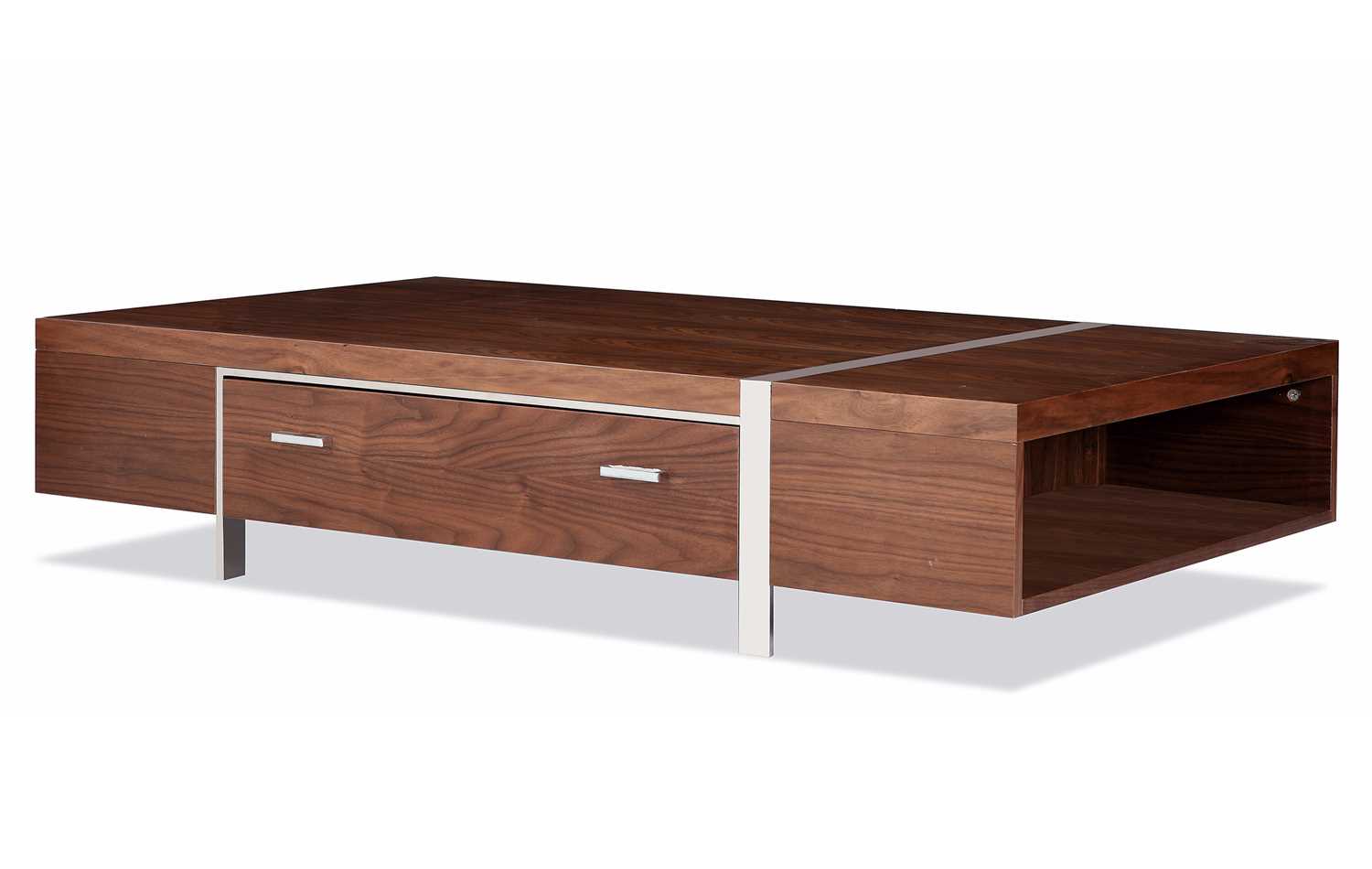 Description Black Oak veneer coffee table with silver trim. Has a central drawer for easy storage as well as open compartments on the side. Has matching TV Stand #TV09.