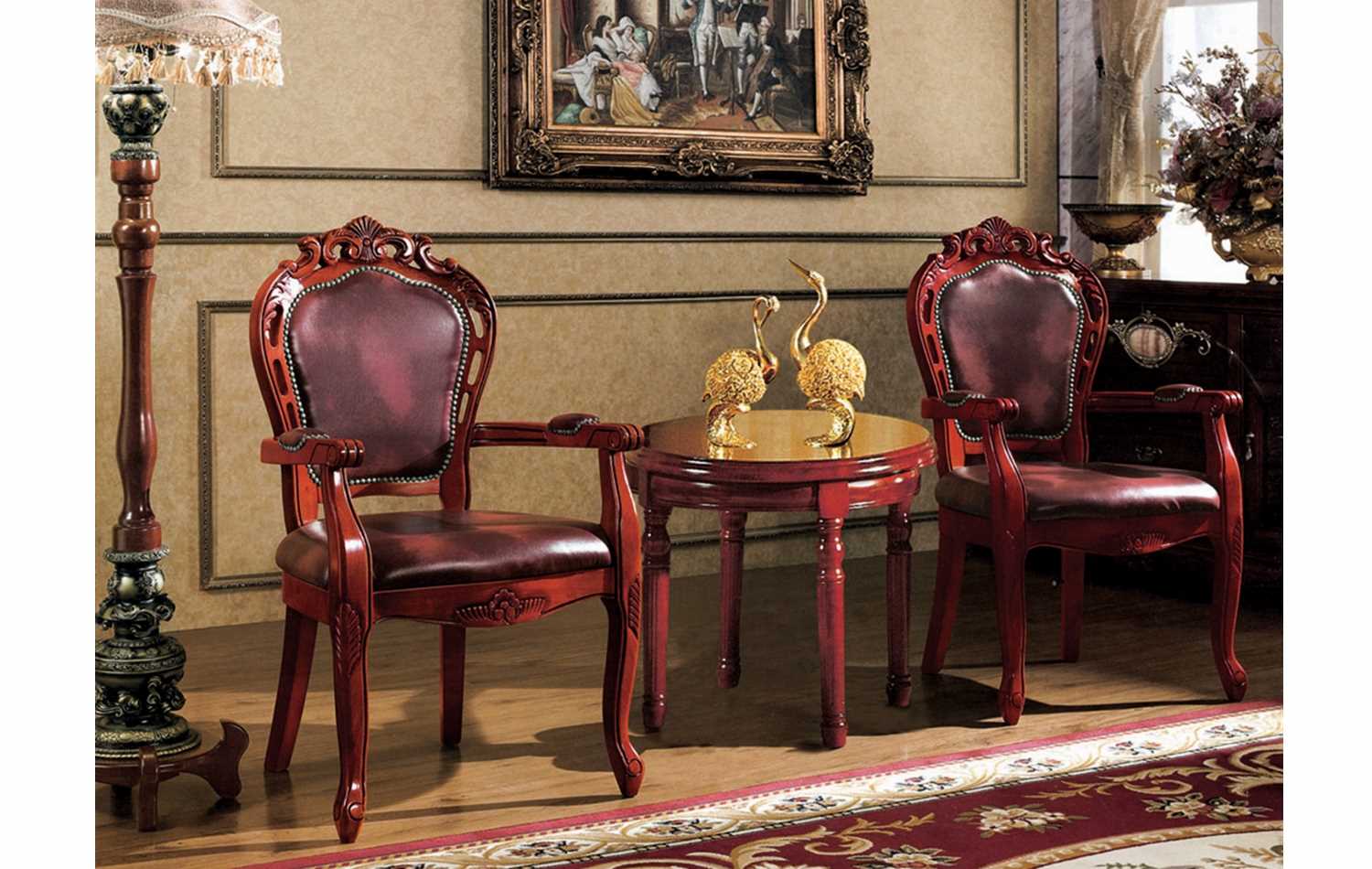 Description This classic reception set consists of two solid mahogany chairs in a light fabric or two tone leather and a round table with a solid marble table top.