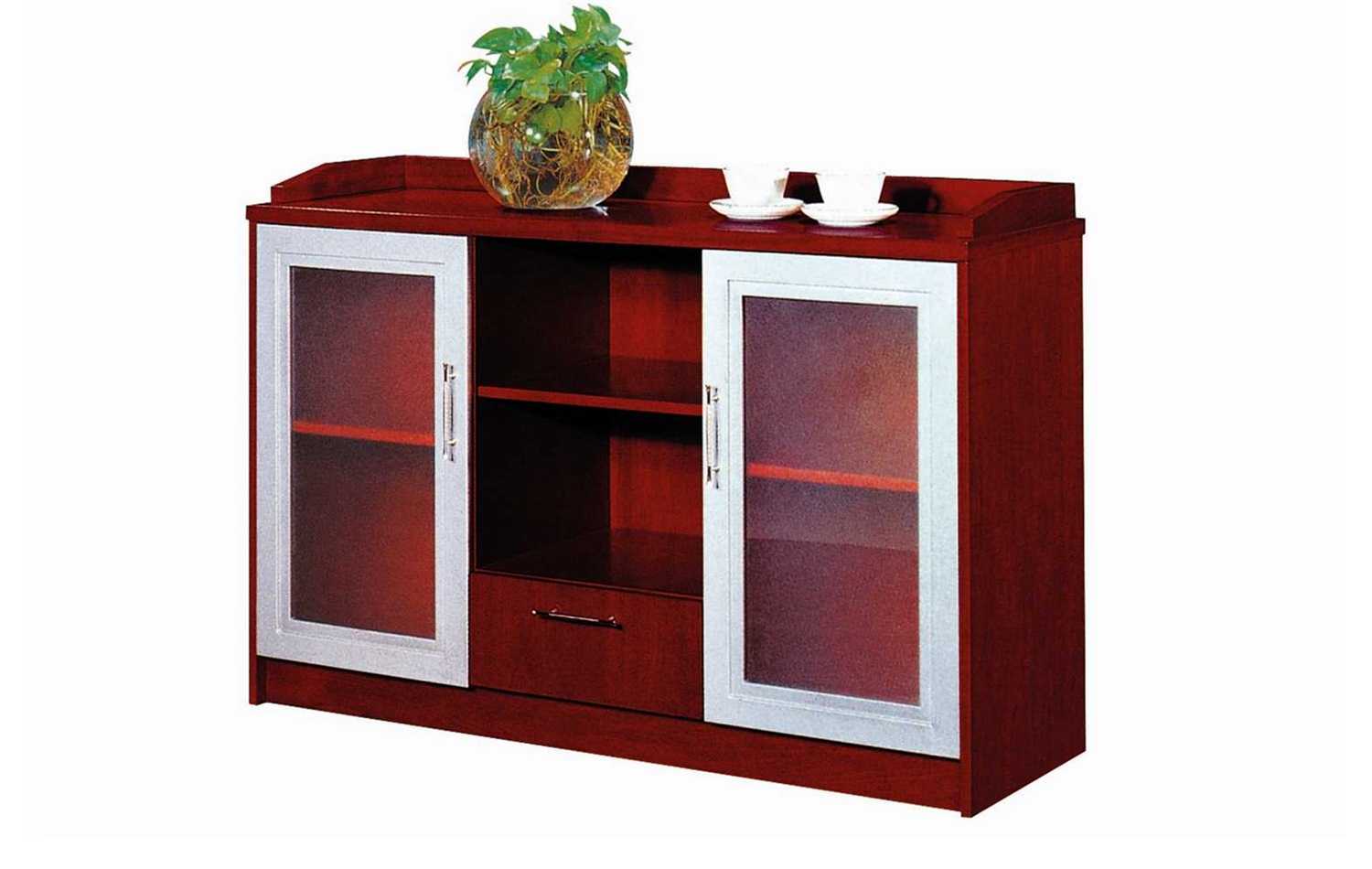 Description This aluminium framed glass door server which consists of central shelving and a central drawer is made from a Mahogany veneer finish.