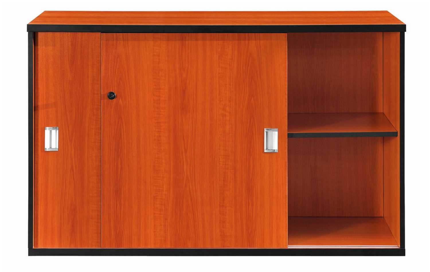 Description Melamine lockable credenza with sliding doors, has internal shelving.