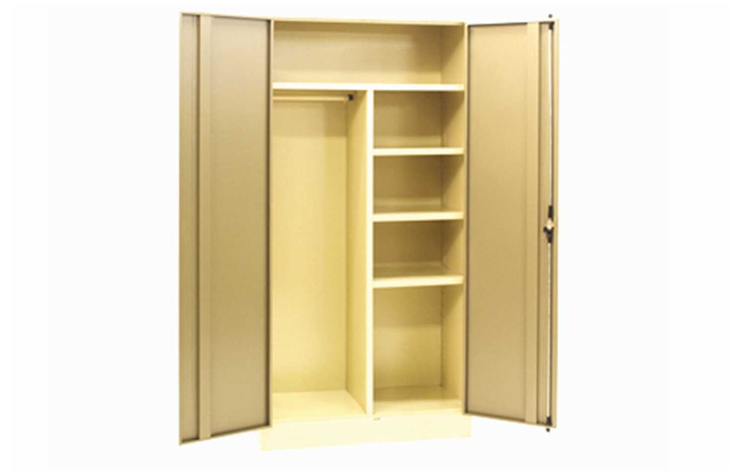 Description Steel two door lockable wardrobe with shelving and rod for hanging clothing.