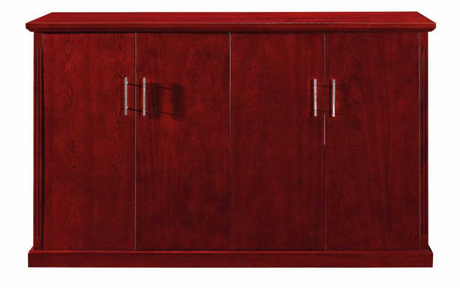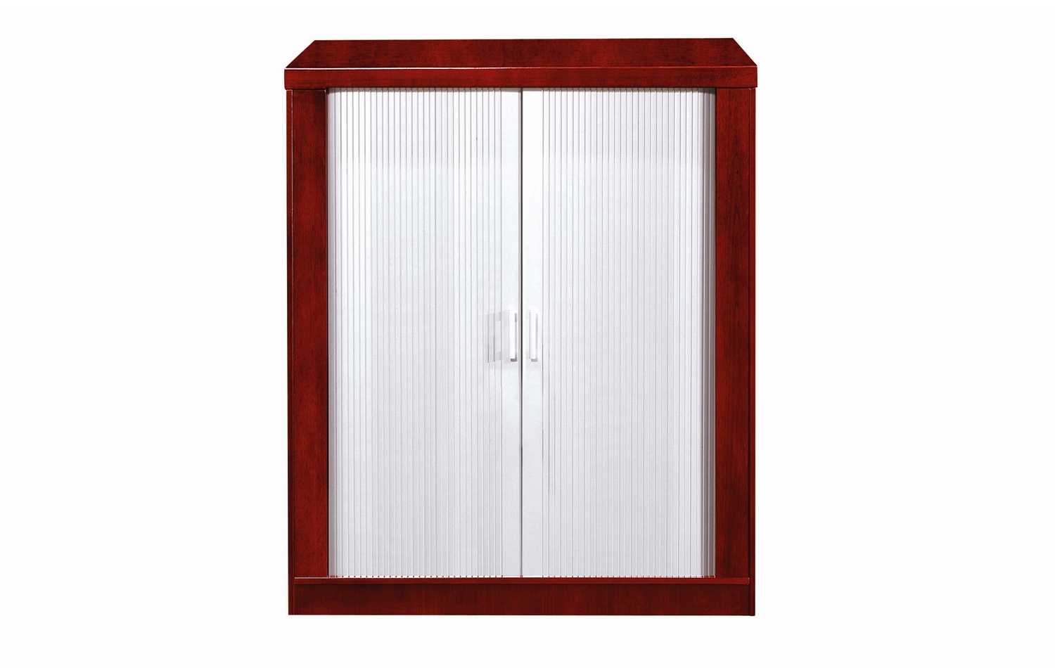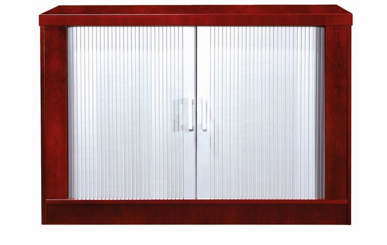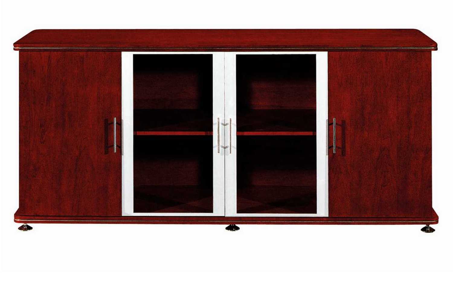 This two door glass aluminium framed system cabinet which consists of internal shelving is made out of a Mahogany veneer finish. It’s ideal for storage.